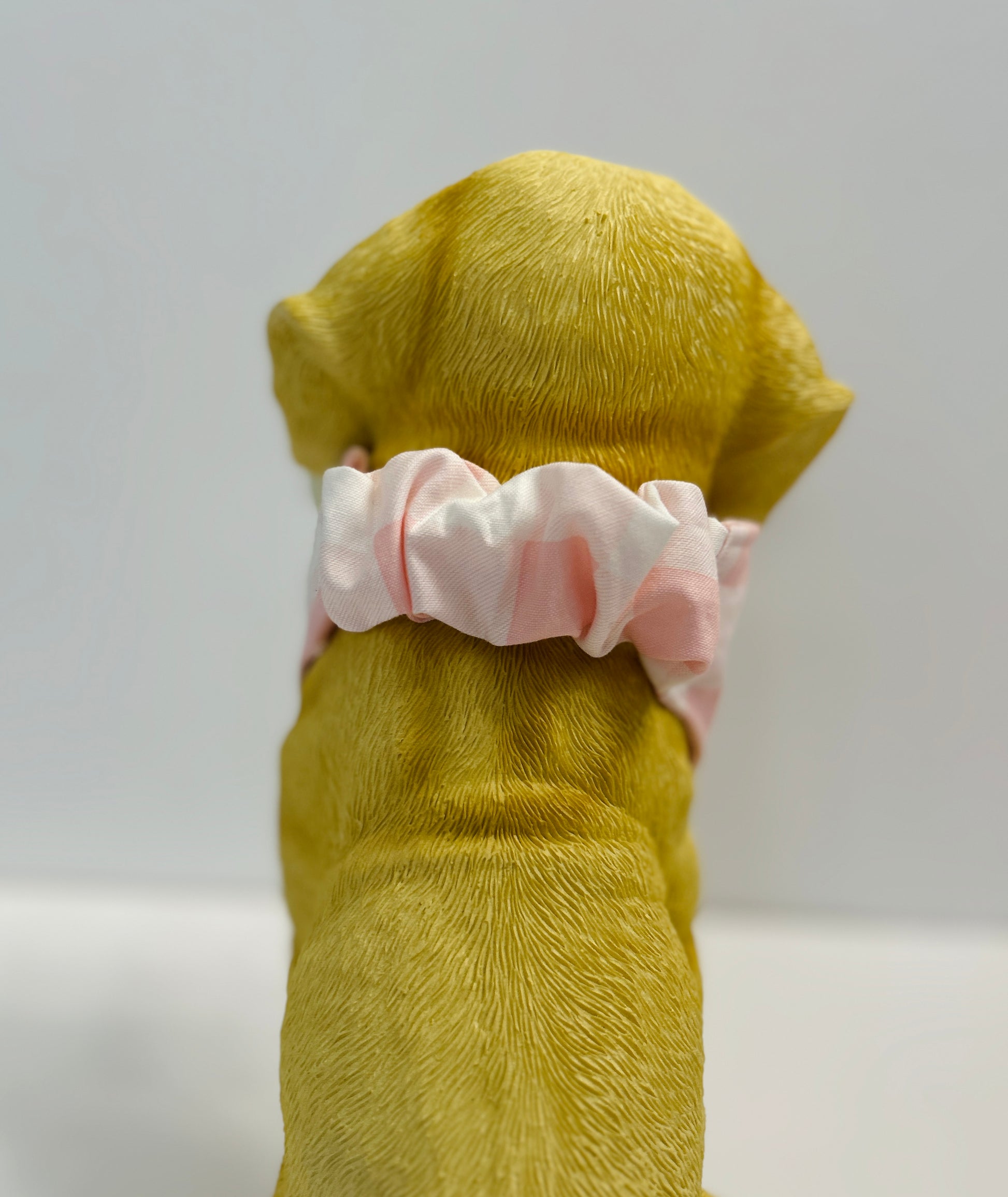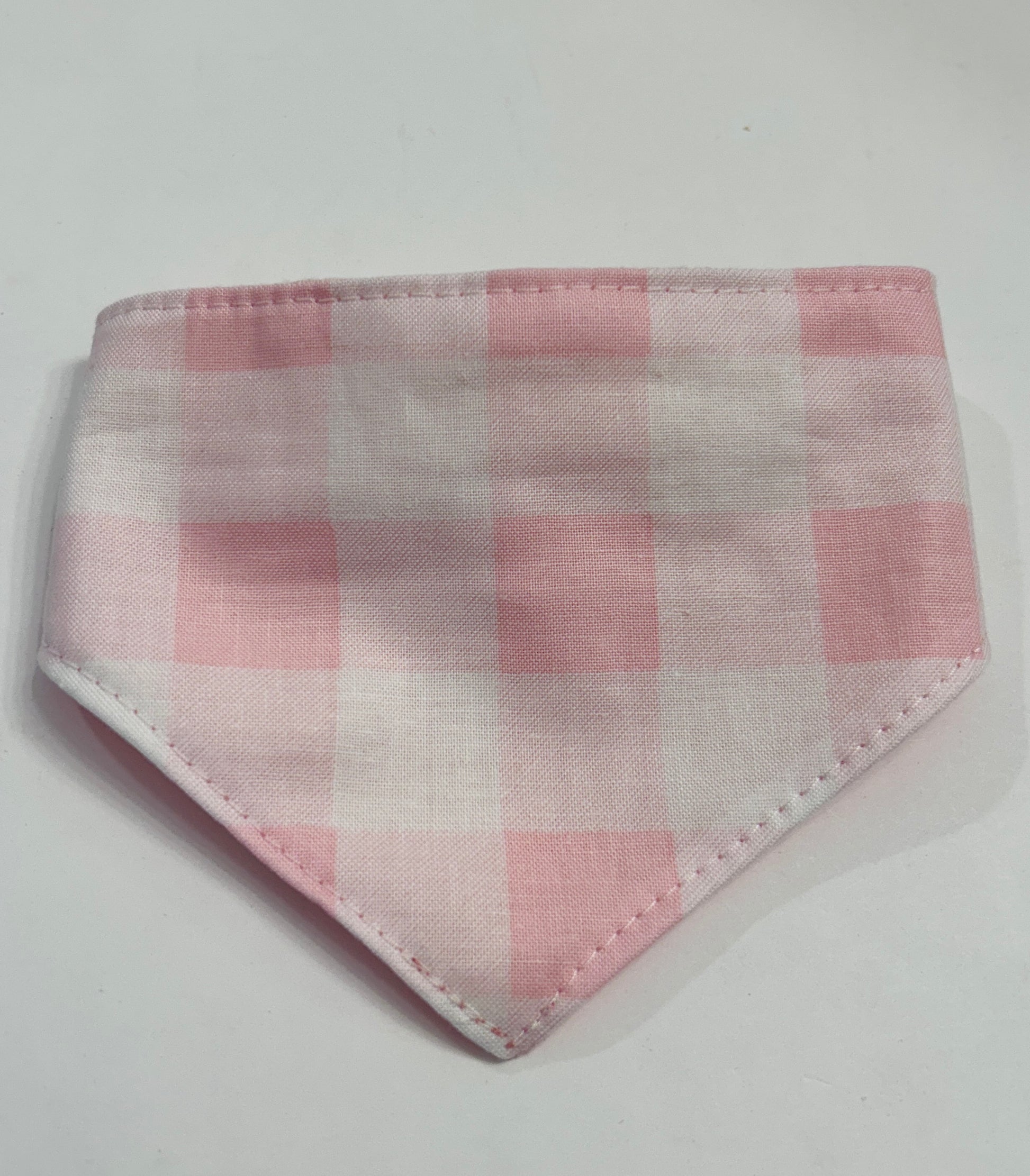 Introduce a touch of springtime charm to your dog's wardrobe with this gorgeous handmade, reversible scrunchie-style dog bandana! This design features a sweet, light pink and white gingham (or buffalo check) pattern on one side, perfect for sunny days and soft looks. The reverse side boasts a cozy, complementary solid light pink ribbed knit fabric, adding texture and comfort for a versatile two-in-one accessory.