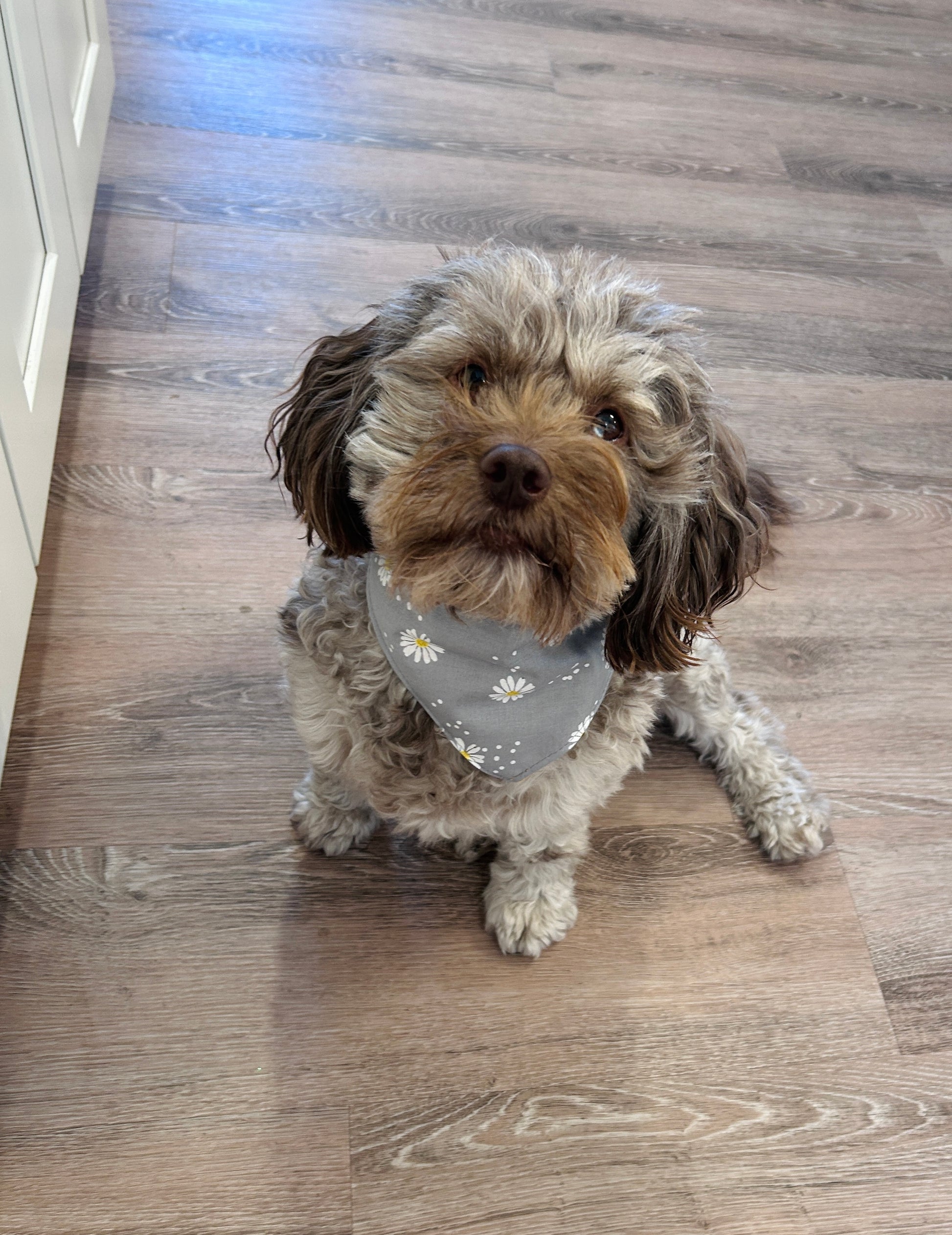 Bring a touch of garden charm to your pet's wardrobe with our Gray Daisy Print Slip-On Scrunchie. This adorable accessory features sweet daisy flowers on a soft gray background, creating the perfect blend of elegance and playfulness!